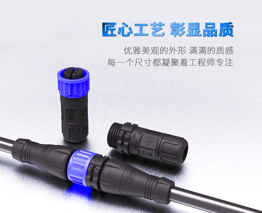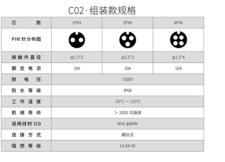 产品系列 产品尺寸 产品芯数 防护等级 电流 C02 M15 4芯 IP67/IP68 10A -