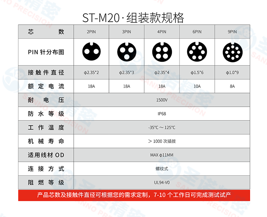 产品系列 产品尺寸 产品芯数 电流 防护等级 ST-M20 M20 2芯 20A IP67/IP68 -
