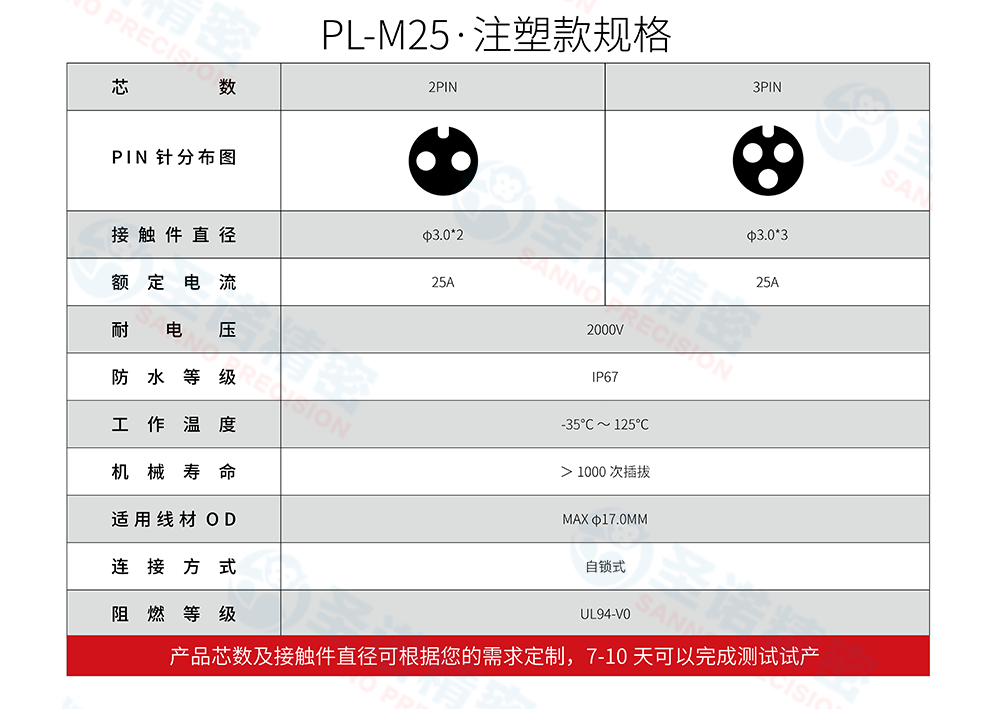 产品系列 产品尺寸 产品芯数 电流 防护等级 PL-M25 M25 2芯 25A IP67/IP68 -